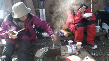 霧氷と雪の自然の美 非難小屋で食事 ぜんざいも頂き1時5分下山開始